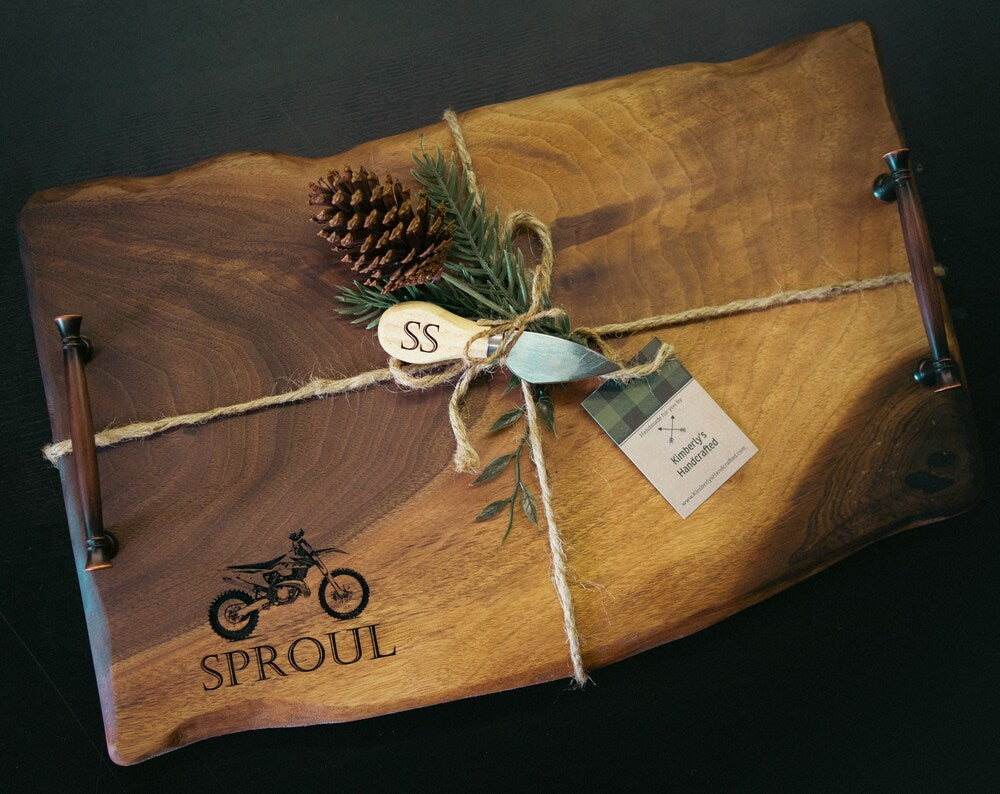 Handcrafted from locally sourced live edge walnut, this custom engraved charcuterie board is both functional and beautiful. With a unique live edge and your choice of personalization, it's perfect for entertaining and adds a touch of elegance to any dining experience.