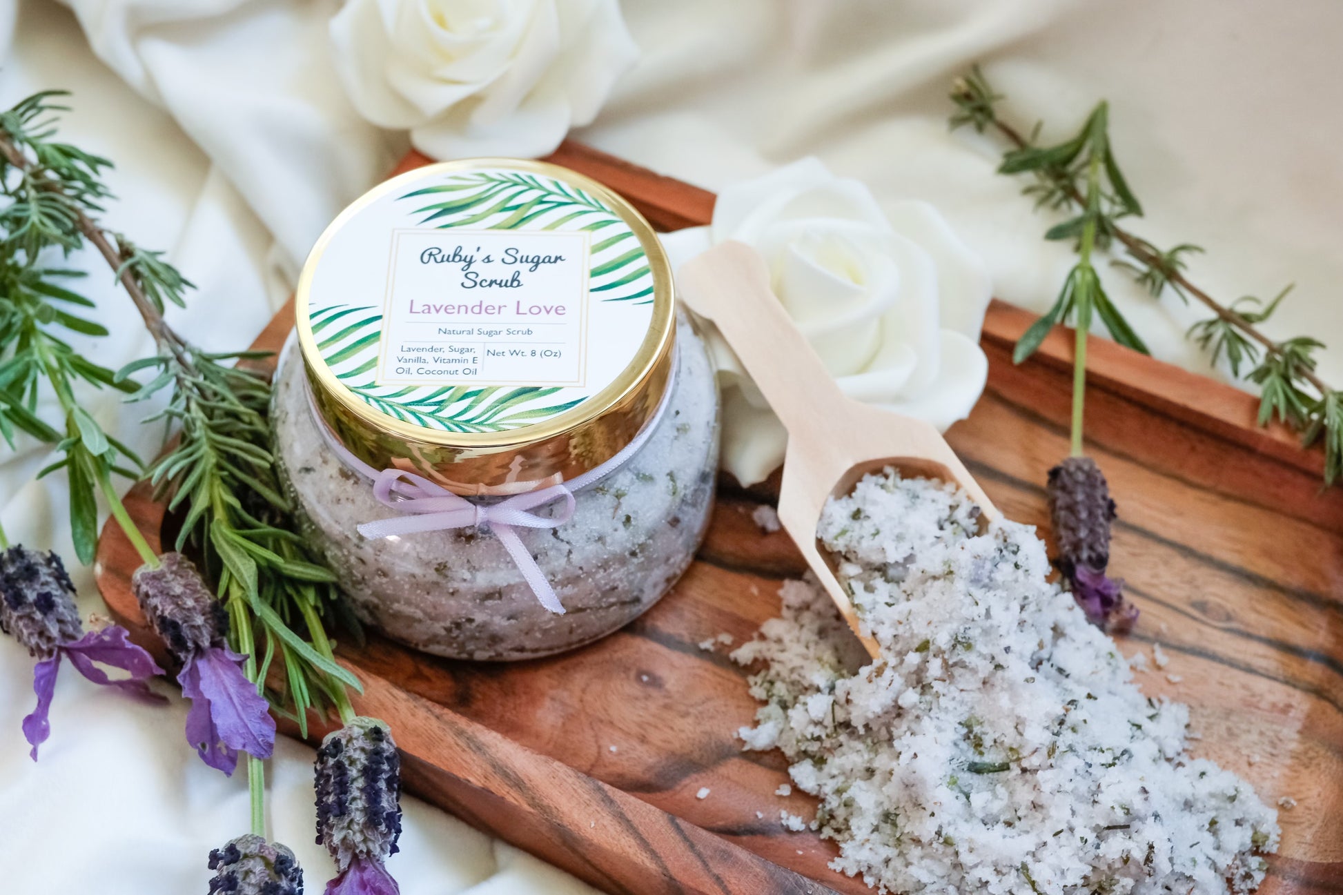 Give yourself a spa treatment at home. This Lavender sugar scrub leaves skin silky smooth and moisturized with the relaxing scent of lavender. The Lavender Sugar Scrub has all natural ingredients including Lavender, cane sugar, vanilla extract, vitamin E oil, and Coconut oil. This 8oz jar will go a long way as there is no fillers added to the scrub.